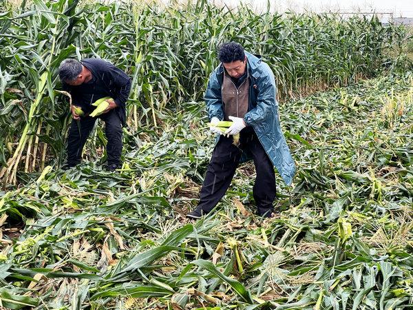 公司种植的400多亩甜玉米如果错过收获期,将损失巨大。可雨势一直未停,田间泥泞不堪,常规收割机无法作业,丰安公司经理刘佳紧急调度了几台“四不像”拖拉机及装载机,全体员工冒雨下地,抢收作业。有些低洼地块连拖拉机也进不去,刘佳带领刘磊、石峰、化立成、王继唯、张海森等员工,跳进齐膝的泥水里,一穗一穗地徒手掰下,再深一脚浅一脚地肩扛手提运到地头。雨水混着汗水,衣服沾满泥浆,每个人都在拼尽全力,只为多抢回一穗玉米,保护丰收果实。