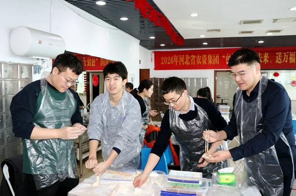 在河北农资大厦职工食堂内,每张桌子上面团、饺子馅和工具早已摆放就绪,大家围在一起共同包饺子。各部门积极参与,分工明确,纷纷秀出自己的绝活,不一会儿各式各样的饺子就出现在托盘中,“年味儿”瞬间扑面而来。饺子虽小,情谊至深,大家把欢乐、希望和祝福一同包进饺子中。大家围坐在一起吃着热气腾腾的饺子,畅谈2025年工作收获,畅想2026年工作愿望。